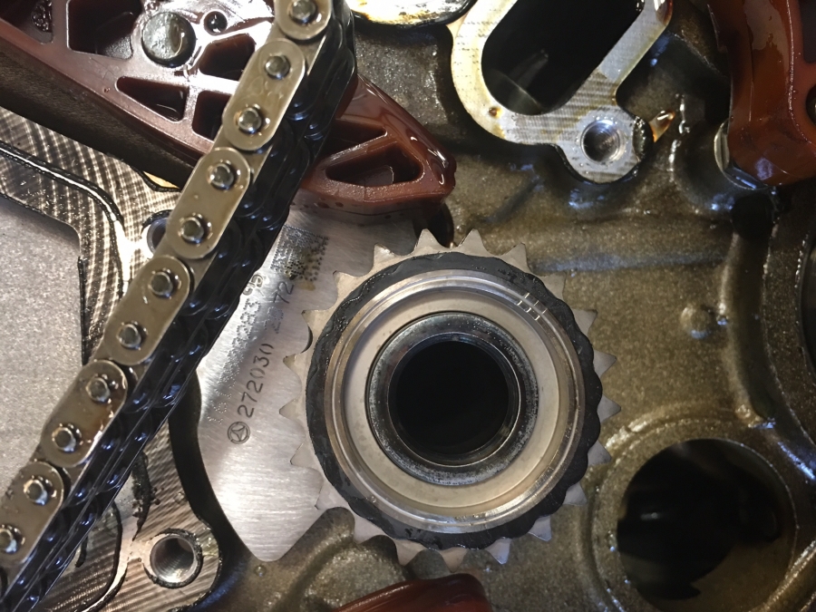 Some Mercedes V-6 and V-8 M272 / M273 engines are prone to a failure of the balance shaft sprocket or idler gear sprocket. What happens is the timing chain wears the softer metal on the sprocket down and in turn slack is developed in the chain. The timing chain tensioner is able to compensate for the slack, however when this happens it causes the right bank camshafts to go out of time slightly. At first the only indication will be a check engine light with one or more of the following fault codes.